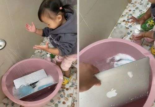 Батькові слова потрапили на благодатний ґрунт, адже їх почула маленька донька чоловіка, яка вирішила допомогти. Саме тому дівчинка вирушила у ванну, налила у таз воду і почала начисто відмивати ноутбук із милом.