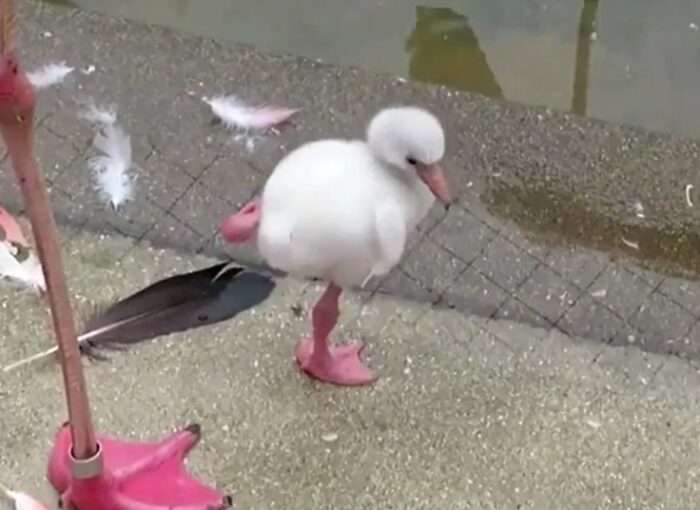У соцмережах стало вірусним відео, в якому маленький фламінго вчиться стояти на одній нозі. Поки ще білосніжна пташка смішно піднімає одну лапку і намагається піджати її так, щоб утриматися на вазі, стоячи на одній нозі.