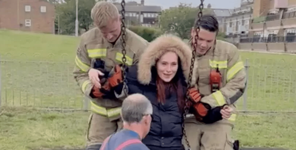 Сміялися всі: молоду маму, яка застрягла в дитячій гойдалці, врятували пожежники (фото)
